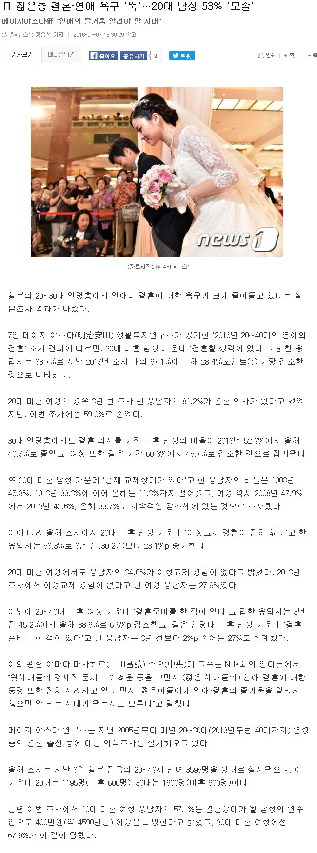 일본 젊은층의 모쏠 비율