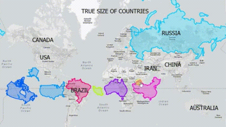 땅덩어리 큰 나라들을 적도로 옮겨보면?