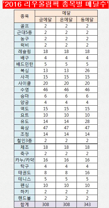 올림픽 종목별 메달수