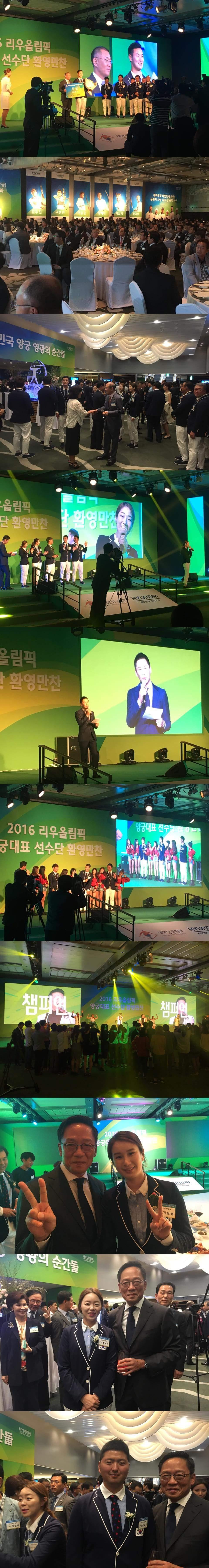 * 현대차 주관으로 회식 장소는 삼성동 코엑스 인터콘티넨탈 호텔* 선수단은 물론 가족, 역대 메달리스트 등 관계자들을 전부 초청함* 정의선 부회장이 직접 참석해 선수단에게 포상금 25억을 지급* 환영식 사회자로 신동엽 섭외* AOA, 싸이 등을 축하공연 가수로 섭외 놀자24 : http://nolja24.co.kr/bbs/board.php?bo_table=humor&wr_id=8543 3