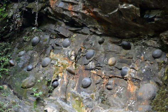 1) 석회질로 이뤄진 절벽 암반 일부가 아직 파악되지 않은 이유로 딱딱한 돌구슬 형태로 응고.