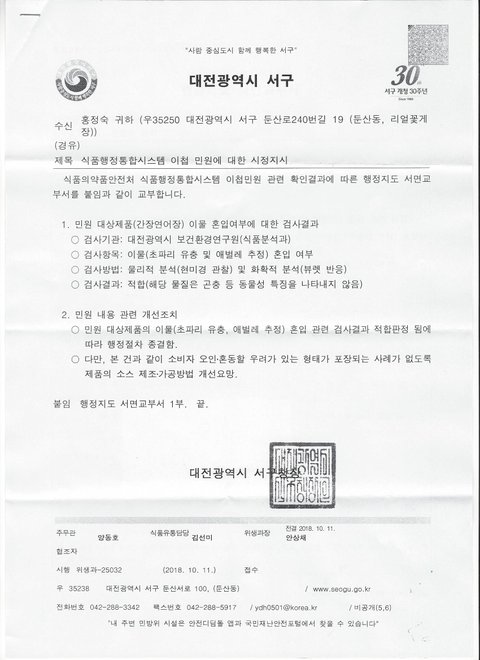 위 원글의 업체입니다. 이전에 제가 답글에 검사결과가 나오면 알려드리겠다고 약속하여 이렇게 글을 씁니다.