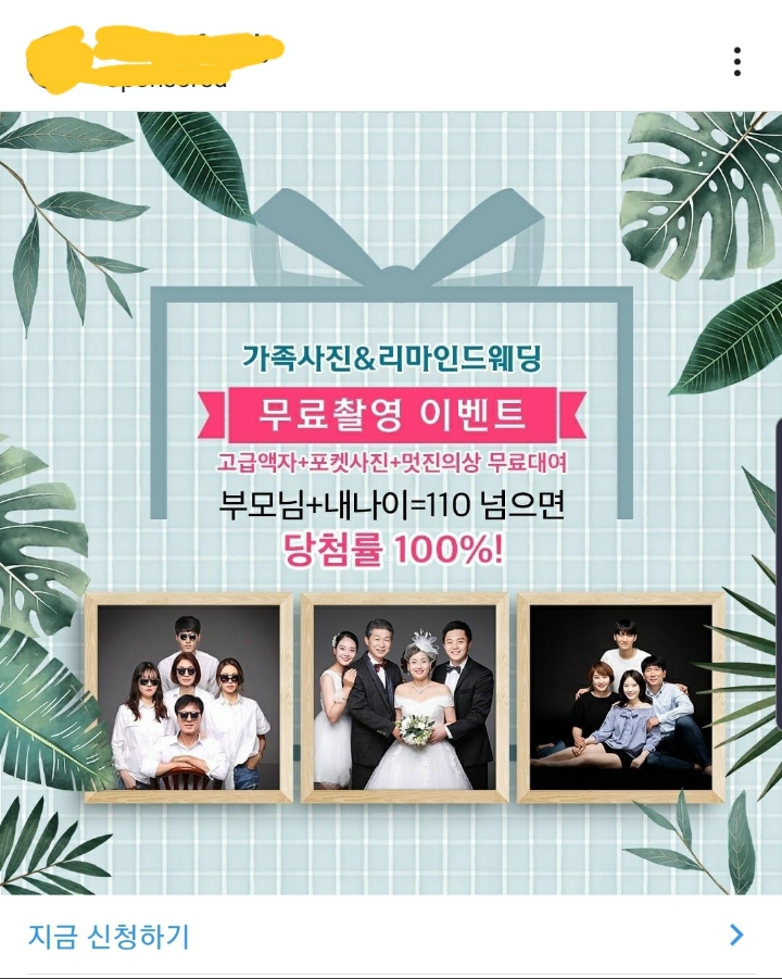 주로 인스타그램이나 페북에서 20대 청년들을 상대로 하는 일종의 과장및 허위광고를 통한 사기성 이벤트로, 무료인척 광고하고 촬영후 터무니없는 돈을 요구하는 이벤트입니다......