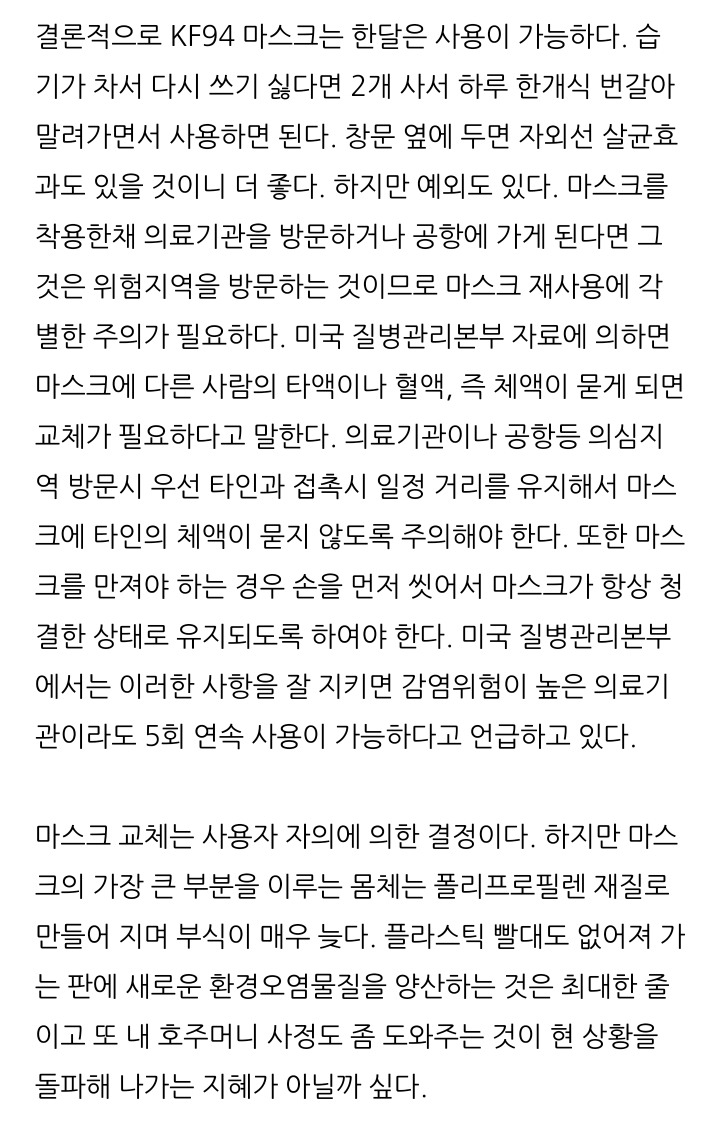 세줄 요약1. KF94 마스크는 한달은 써도 된다.2. 타인에 의해 오염되었다고 느낄때는 교체하자.3. 병원이나 공항에 다녀오면 더 빠른 주기로 교체하자.추가로 이분 블로그에 마스크들 리뷰가 있으니 참고하시기 바랍니당.굳이 마스크 사재기 하느라고 생돈 쓰지 마세여.https://blog.naver.com/airworks/221788831908http://oppaya.net/bbs/board.php?bo_table=humor&wr_id=841288 6618