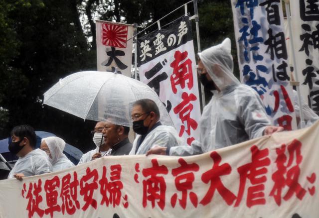 일본의 패전 76주년인 15일 일본 도쿄도(東京都) 지요다(千代田)구 소재 야스쿠니신사(靖國神社)에 비가 내리는 가운데 우익 성향으로 추정되는 이들이 일본군 위안부 문제와 난징(南京)대학살 관련 기술을 교과서에서 삭제하라고 요구하는 현수막을 들고 있다. 도쿄=연합뉴스
