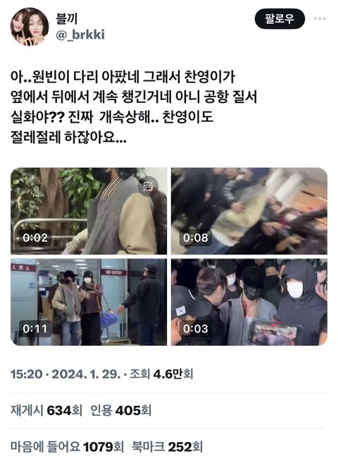 https://x.com/_brkki/status/1751852891189698888?s=46 진짜 공항 따라가는 거 현타 안 옴? 고작 몇분 보고 트위터로 오늘도 수고했엉 ㅜㅜ 조심히 들어가 ㅇㅈㄹ하고 전에 공항 질서 공지 올라왔을 때 왜 욕했던건지 이해가 안 감 ㅈㅂ 나도 브리즌데 일부(같지도 않음) 붙순이년들은 자중 좀 했으면17
