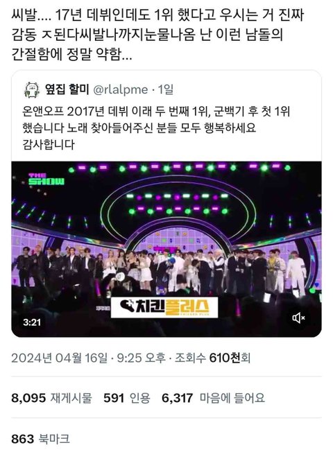 돌아가신 엄마 얘기도ㅠㅠ 다른 아이돌들도 울먹거림온옾 한창 상승세일때 그룹 지키려고 다같이 동반입대 결정해서 충격이었는데 돌아와서 1위해서 다행임