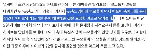끝나긴 뭐가 끝나. 애들이 미성년자인데 부모가 대신 발언하는게 뭐가 문제야. 같은 회사에서 컨셉 똑같은 아이돌 데뷔하는건 반발할 만도 함. 게다가 뉴진스 데뷔 2년도 안됨