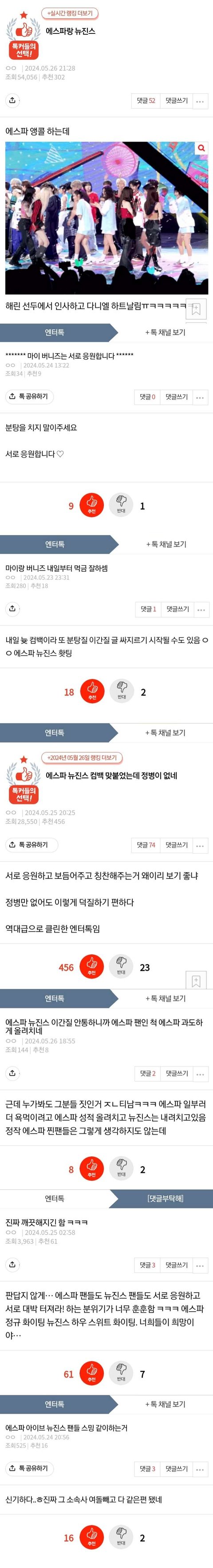 지금도 버젓이 톡선에 친목이 어쩌고 글이 있고 ㅋㅋㅋ 오늘 민희진 기사가 터지기전까지도 버니즈와 마이는 어쩌고 저쩌고 눈물나는 케미를 보여줄것처럼 하더니 지금은 어떠냐? ㅋㅋ 피어나랑 마이 이간질하는건 버니즈라면서 아주 민천지 버니즈만 공공의 적이 되버렸네 ㅋㅋㅋ 그리고 스밍리스트에 에스파는 또 끼워팔고 이게 커뮤 정치질 끝판왕 슴천지들 방식임 알겠냐? 슴천지들만 항상 피해자임 ㅋㅋㅋ 지들까는건 그때 그때 상황봐서 판엔 얼마 있지도 않은 릇저씨가 됐다가 압저씨도 됐다가 이젠 버니즈가 된거임 ㅋㅋㅋ2741
