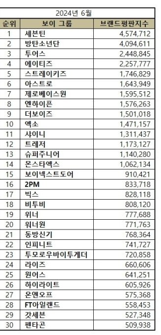 세븐틴, 방탄소년단, 투어스, 에이티즈, 스트레이키즈, 아스트로, 제로베이스원, 엔하이픈, 더보이즈, 엑소, 샤이니, 트레저, 슈퍼주니어, 몬스타엑스, 보이넥스트도어, 2PM, 빅스, 비투비, 위너, 워너원, 동방신기, 인피니트, 투모로우바이투게더, 라이즈, 원어스, 하이라이트, 온앤오프, FT아일랜드, 갓세븐, 펜타곤 순으로 분석됐다.