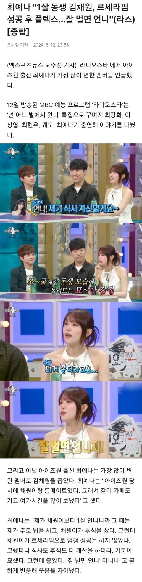 최예나 "1살 동생 김채원, 르세라핌 성공 후 플렉스...잘 벌면 언니"