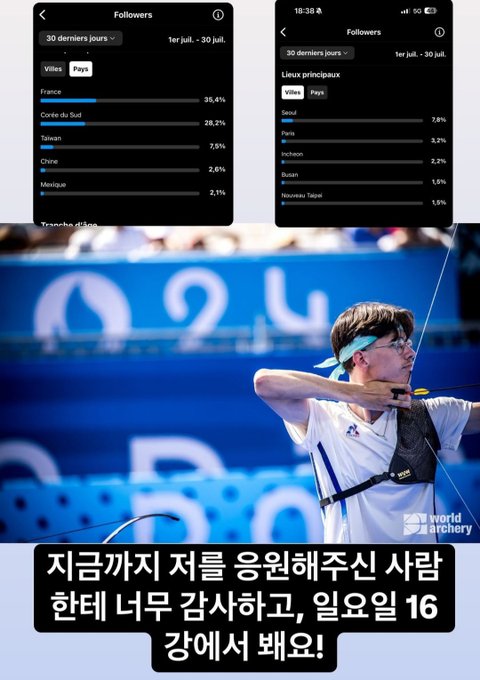 프랑스 잘생긴 양궁선수 인스타 스토리 ㅋㅋㅋㅋㅋㅋ