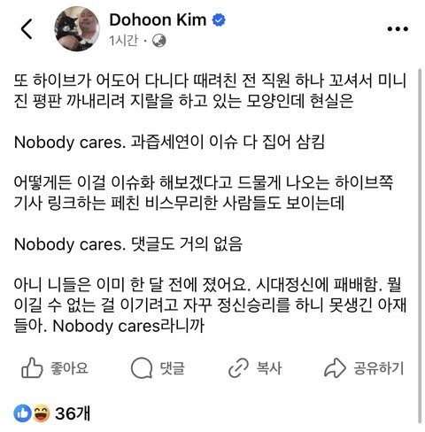 하이브 지금 민대표 마녀사냥 하는 거나, 소속 아티스트 케어하는 거나, 의장이라는 사람 사생활 스캔들이나 몇달 동안 보여준 행보 정말 짜치는 거 알아?