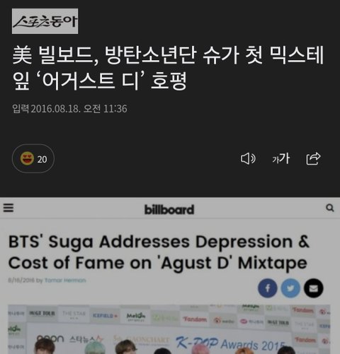 빌보드, 방탄소년단 슈가 첫 믹스테이프 어거스트 디 호평