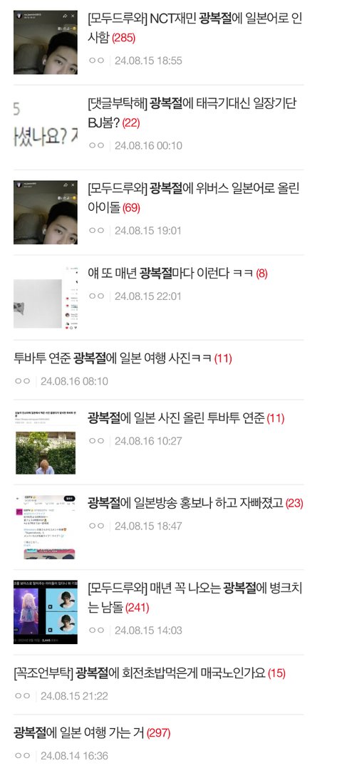 광복절을 기념해서 우리나라가 독립하게 된걸 기뻐하고 기념하자, 조상님들의 희생을 기리자는 말은 톡선 어디에도 1도 없는데 무슨 아이돌이 일본노래 몇초 흥얼거린거, 아이돌 출연한 일본방송 홍보트윗 올라온거, 인스스에 일본어 네글자쓴거로 조카불타는 글만 톡선에 가득함ㅋㅋㅋㅋ 니들은 광복절이 맘에 안드는 유명인 단체로 조지는 날로 생각하는 거 아님? 누가누가 일본 조금이라도 언급하나 눈에 불을 키고있다가 진짜 뭐 하나라도 걸리면 기다렸다는 듯이 단체로 지랄들이잖아 평소에도 그렇게나 애국자야 너희? 광복절이 자국민들끼리 물어뜯고 공격하는 날이었어? 이날에 일본 몇글자 언급하는게 왜 그렇게나 지랄할 일인지도 모르겠고 그냥 요즘 대중들 꼬라지가 너무너무 한심함ㅋㅋㅋ 제발 정신좀 차려 좋은날도 니들이 이상하게 만들고 있어 183