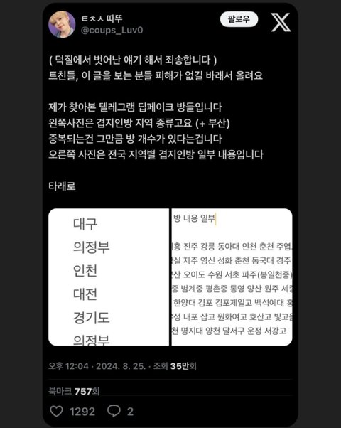 텔레그램 이런데서 공유된대 거기 대구소재 왠만한 학교 다 있대… 우리 학교도 있더라 ㅅㅂ 걸린게 대구경북이지 실제로 타지방도 있을거 같거든?? 얘들아 진짜 조심해