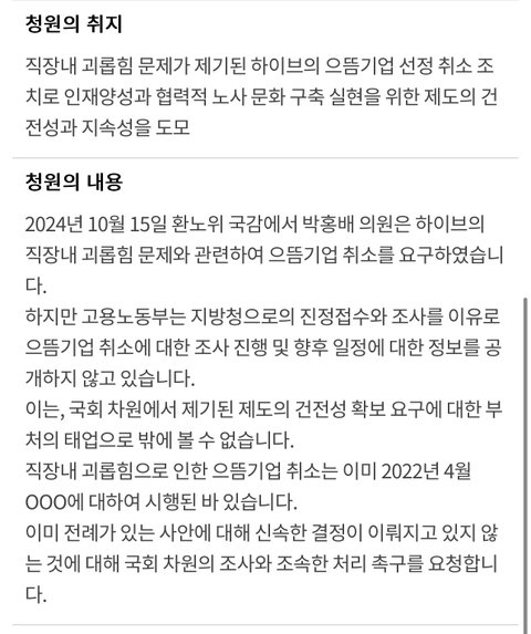 하이브 으뜸기업 취소 국민청원