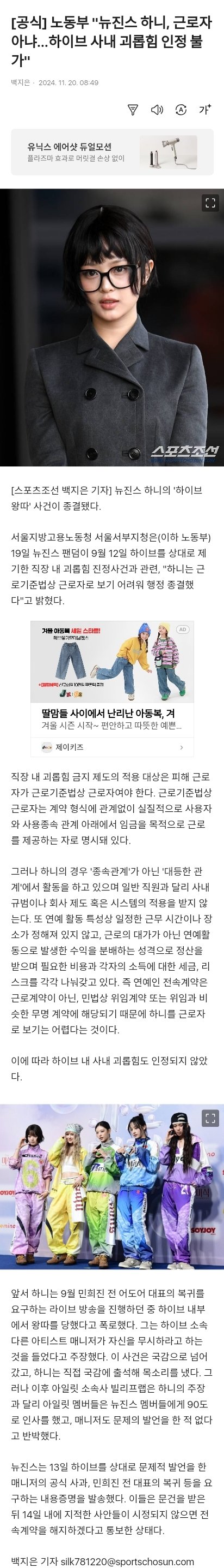 [공식] 노동부 "뉴진스 하니, 근로자 아냐…하이브 사내 괴롭힘 인정 불가"