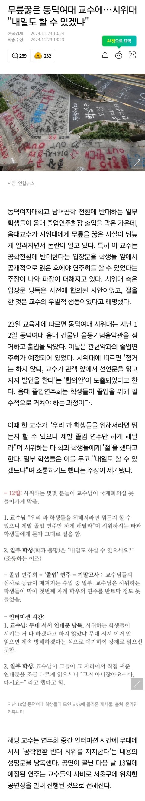 무릎꿇은 동덕여대 교수에 시위대 "내일도 할 수 있겠냐"