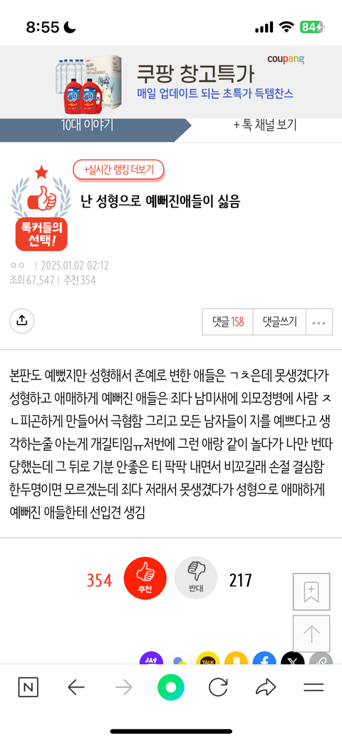이런글 많아서… 난 그냥 콤플렉스 고칠려고 한건데.. 절대 남자한테 관심받을려고 발악도 안하고 인스타에 내 사진 올리지도 않음… 가끔 사람들이 코 이쁘다고 그러면 성형한거라고 밝힌단말임.. 이쁜애들한텐 이쁘다하고.. 근데 이 글 말고도 이런류의 글이 너무 많아서.. 성형 괜히 했나 싶고.. 그럼……….. 콤플렉스 사라져서 이건 좋은데 안좋은거 같기도 하고.. 하12