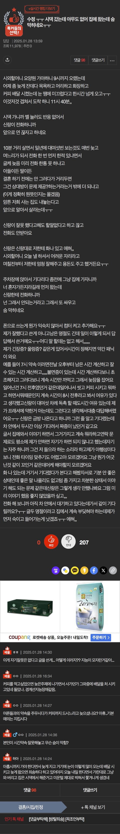 아니 대체 늦잠 잤는데 뭔 커피를 배달시키고 자빠짐? 그냥 커피알갱이 씹어먹지. 남자도 참 어떻게 저런거랑 결혼할 생각을.