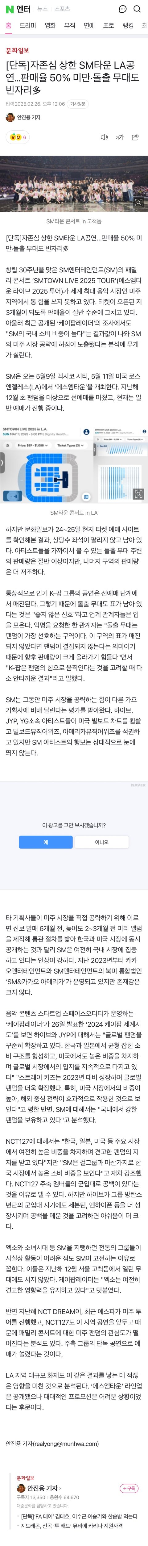 자존심 상한 SM타운 LA공연…판매율 50% 미만·돌출 무대도 빈자리多