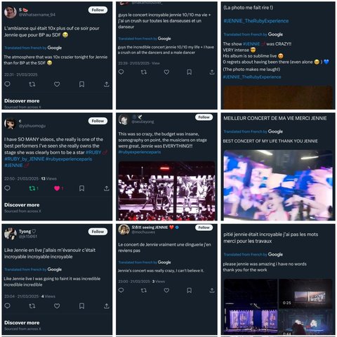 파리콘 간 사람들 '내 인생 최고의 콘서트'라고 말하는 사람이 수두룩 할 정도로 반응 좋음ㅋㅋㅋㅋㅋ 오늘 뜨는 영상 보니까 파리콘 관중 텐션이며 제니 무대력이며 둘다 미친듯ㅋㅋㅋㅋㅋㅋ 관중들 텐션이 미쳐서 제니도 날라다님ㅋㅋㅋㅋ 밑에는 제니 파리콘 짤 몇개 퍼옴 타이틀곡 LIKE JENNIE 떼창부터 https://x.com/jenniepics/status/1903189356325769279?s=46댄스곡 ExtraL 떼창with the IE 떼창 https://x.com/jenniepics/status/1903187301129392476?s=46발라드 F.T.S까지 떼창 (라이트 알아서 다 켜줌ㅜ) https://www.instagram.com/stories/jayyhancock/3593437981205350543?utm_source=ig_story_item_share& Filter 자유자재로 음 바꿔부르는 제니 ㄹㅈㄷ.. (보컬도 ㅈㄴ 늘었어) https://x.com/em_landing_on_y/status/1903187433992204388?s=46솔직히 타이틀곡 떼창도 한국어랩 파트까지 저렇게 떼창하는 게 놀라운데 루비 막트랙 발라드들 떼창이 ㄹㅇ 놀라움.. k팝 솔로 최초 프랑스 스포티에 4곡 동시에 집어넣고 한국 여솔 최초로 프랑스 앨범 차트 4위한 거 보면 프랑스 제니 많이 좋아하나봐ㅋㅋㅋㅋ 코페르니 공동 창업자&CEO 제니콘 방문 파리 샤넬팀이랑 제니♡ 마지막은 콘 퇴근길 파리팬들한테 인사하는 제니블랙핑크 블핑 제니10168