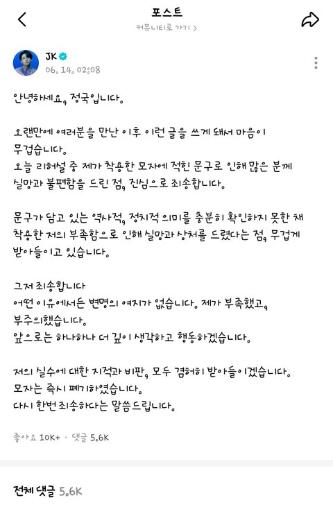 Best그냥 보면 평범한 검은 모자던데 문구까지 세심하게 못봤을수도 있겠지 근데 너무 슈스니까 본인 영향력 생각해서 뭐든 조심하는게 좋음 코디들이 준 옷 그냥 입어도 생각없다고 까이니까 애초에 논란 생길일 안만드는게 최선임 암튼 바로 사과해서 다행임