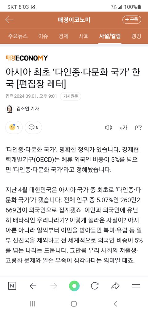 잘 모르는 사람들이 많은데 작년에 우리나라가 중국, 일본을 제치고 아시아에서 유일하게 다인종, 다문화 국가로 선정됨. 이건 우리나라는 미국, 캐나다와 같은 다인종, 다문화 국가가 됐다는 의미야. 이제 단일민족이란 얘긴 꺼내면 안 되고 다른 나라에서 와서 정착해서 사는 사람들을 같은 한국인으로 인정하고 혜택을 줘야 함. 11