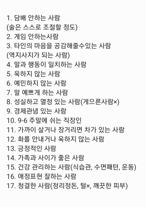 살면서 생각한 이상형을 써놓건데 저걸 다 충족하긴 현실적으로 어려운건가 싶기도 하고 객관적으로 힘든 조건인지 궁금해서 올려봐요 참고로 글쓴이 본인은 저걸 다 충족하냐고 물었을때 제가 저렇게 행동하고 추구하기 때문에 쓴 조건이라고 생각해요35