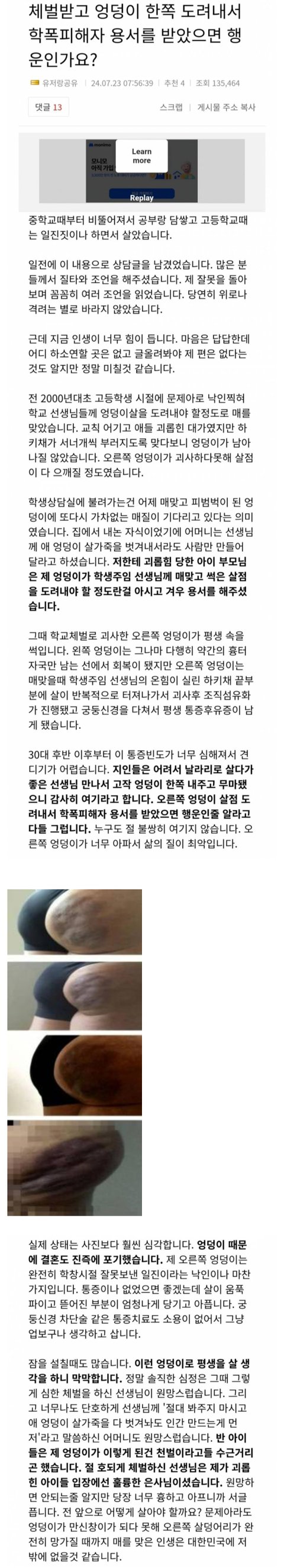 날 괴롭힌 그 인간말종도 저 사연속 일진처럼 선생님 엄벌에 엉덩이라도 작살났다면 조금 속이 후련할텐데