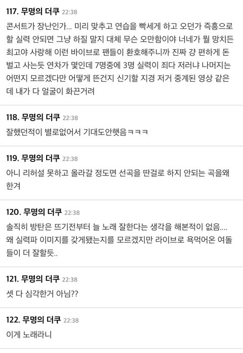 Best입막음 개심해서그렇지 돌판커뮤좀해봤다싶은사람이면 방탄 명성만큼 실력대단하지는않다고여길껄ㅋㅋㅋㅋ 자리가과분하지