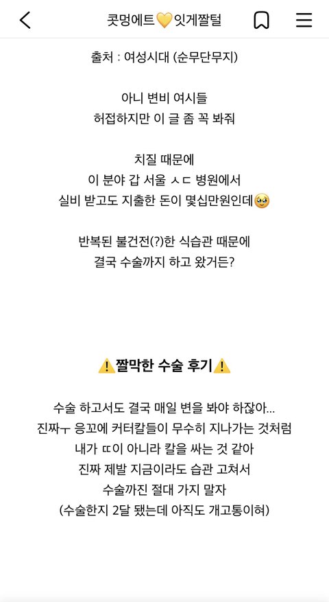 치질수술 하러 항문 전문 큰병원 갔더니 20대 여성이 절반이라서 놀랬음. 다이어트, 식습관만 고쳐도 안걸립니다. 치질은 수술후 아픈것보다 솔직히 병원에서 검진받고 수술후에 마사지 받는게 더 치욕적이다