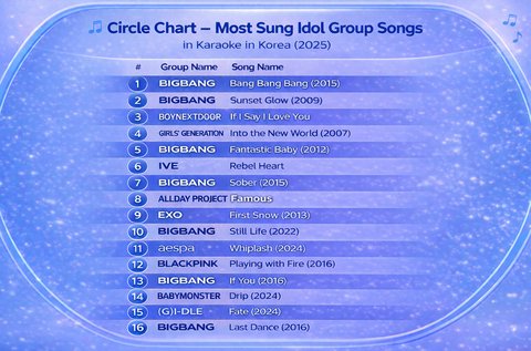 Circle Chart에서 2025년 기준으로 매달 전국 노래방에서 제일 많이 불린 곡들 공개했는데.. 총 16개나 되는 아이돌 그룹 곡이 리스트에 들어갔다고 함. 근데 그중에 올해 나온 신곡은 딱 3개뿐이라더라… 진짜 예전 명곡들이 아직도 노래방 장악 중인 듯 ㅋㅋㅋ