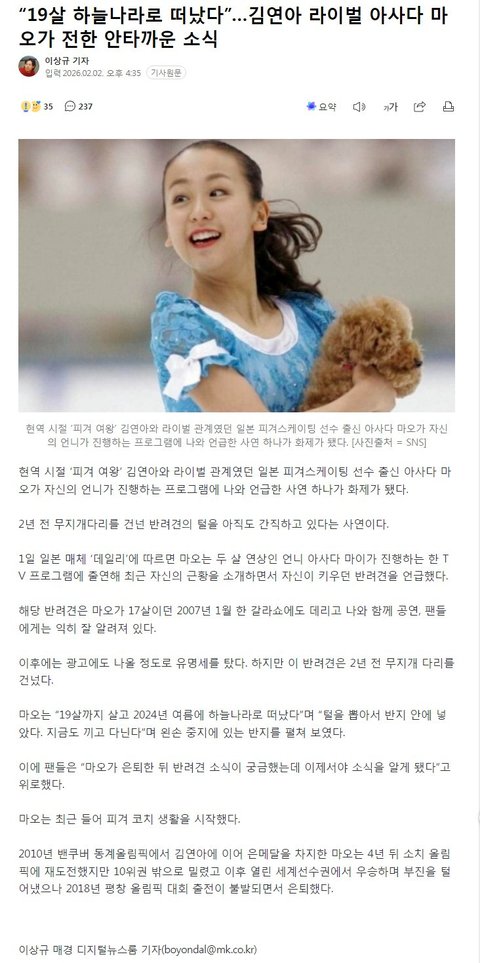 김연아 라이벌 아사다 마오 사망