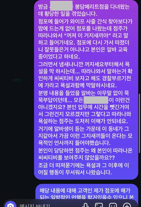 육아휴직으로 회사에서 받는 급여가 없으니, 음슴체로 쓰겠음 2월 5일(목) 어제 겪었던 일이었음 모처럼 친구 만나서 저녁에 술 한잔하고 집으로 돌아오고 있었음 밤 11시 경이었는데 친구 만나고 오라고 해준 와이프가 고마워서 간식거리라도 사갈까 해서 근처 편의점으로 들어갔음 해당 편의점은 내가 내린 동남메리트 버스정류장 근처에 이름이 숫자로만 이루어진 편의점임 편의점에 들어가서 초콜릿, 과자, 아이스크림 쪽도 둘러보고 와이프 취향의 간식이 없어서 아무것도 사지 않고 그냥 매장에서 나왔음(이것저것 둘러보느라 매장에 오래 머물긴했음 5~10분정도) 매장에서 나와서 한 5미터 정도 걸어갔는데 뒤에서 “꺼져. 이 거지x끼야!” 라고, 소리치는 게 들렸음 늦은 시간대라 주변에 다른 사람은 없었고 분명 나뿐이어서 나한테 한 말일 거라고 생각이 됨 뒤돌아보니 점주가 그렇게 말하고 문 닫고 들어가는 모습이 보였음 한동안 멍하니 어이없어하다가 편의점으로 다시 들어갔음 물건을 안 사고 갔다고 해서 그런 말을 듣는다는 게 상식적으로 이해가 됨? 점주가 매장 내 창고 쪽에 들어가 있어 찾아가 물었음. “사장님 제가 잘못들은 건 아닌 거 같은데 방금 저한테 뭐라고 하신 거예요?”라고 물으니 “잘못 들은 거겠죠” 이렇게 대답함 보통 진짜 아무 말도 안 한 상황에서 손님이 와서 무언가 물으면 “무슨 일 때문인가요?” 이런 대답이 맞지 않음? 계속 따지며 방금 꺼지라고 하지 않았냐고 하니깐 본인은 창고에서 알바 교육 중이었다고 하는거임 그러면 사장님 출입문으로 움직임이나 확인해 보자고 CCTV 확인해 보자고 하니 “냄새나니깐 꺼져 거지x끼야!” 이렇게 말함 (2차 충격) 보통 이런 상황에 본인이 맞으면 CCTV 보여주면 정확한 거 아님? 그리고 처음 들었던 말과 위에 다시 뱉은 거지x끼 라는 단어를 중복해서 계속함 “동네가 좀 거지 같아서 저런 거지x끼들이 가끔 있어!”라고 알바에서 말하는 걸 들음 (3차 충격) 그 뒤로 나는 CCTV 확인하자, 물건을 안 사고 나갔다고 그렇게까지 말하는데 맞냐?는 식으로 계속 되물었고, 점주는 “꺼져, 거지새X끼야, 냄새나니깐 나가” 이런 말을 반복해서 더 이상 말이 안 통해서 알바에게 이 정도면 어떤 사장 밑에서 일하는지 알 터이니 알아서 잘 판단해서 근무하라고 한마디만 던지고 나옴 집에 와서 분이 안 풀려서 해당 편의점 고객센터에 전화했지만, 당연히 상담 시간이 경과돼서 따지지도 못함 해당 편의점 인스타 계정 팔로우해서 DM으로 해당 건에 대해 주저리주저리 씀(해당 계정은 홍보계정이라 아무 의미 없는 거 알면서도 그냥 썼음.) 씻고 자려고 누웠는데 뭔가 억울하고 분해서 심장이 계속 콩닥콩닥 뛰어서 제대로 잠도 못 잠 아침 9시에 고객센터 연락해 해당 내용 전달은 했고 앞으로 어떻게 진행될지 궁금함 판에 이렇게 글을 쓴다고 달라질 건 없지만 그냥 위로 좀 받고자 이렇게 글 써봄 ※ 참고로 그 편의점 처음 간 곳도 아니고 단골은 아니어도 가끔(1회/달)은 퇴근길에 들려서 맥주나 라면도 사 가고 했던 곳임※ 그리고 그때마다 점주가 불친절한 거도 아니고 오히려 엄청 친절했음
