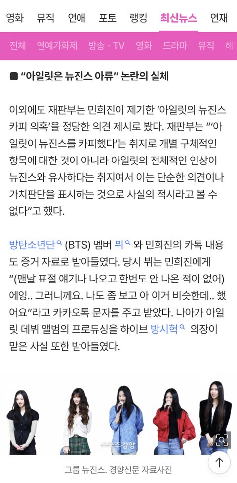 Best사실 비슷하다고 생각했어도 어느 편든거 아니라고 말하는게 맞지. 그리고 저 카톡 증거로 쓴 민희진도 그렇지만 재판기록 비공개 됐는데 이미 쿨 한 번 돈 이슈에서 굳이 저걸 끄집어내서 기사쓰는 기레기들도 투명함. 방탄이 하이브 벗어나면 어떤 꼴이 될지 안봐도 그려짐 ㄷㄷ