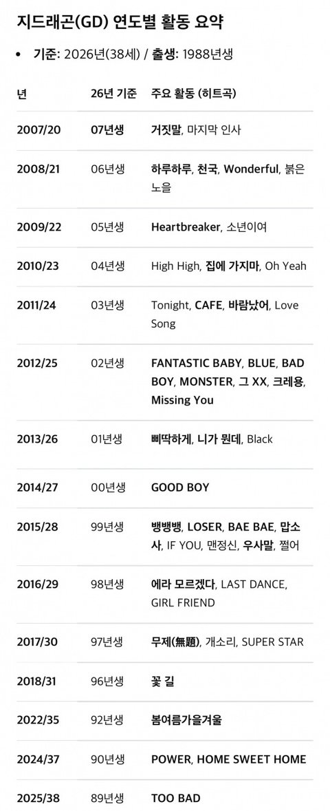요즘 나이로 치면 2007년생이 단독 작사작곡 “거짓말”메가히트 시킨거고 이후 20년간 내는 곡마다 전부 히트곡 + 멤버 솔로곡 (날봐귀순, 대박이야, 링가링가,스트롱베이비 등) 지디가 직접 작사작곡으로 히트시킴 연간차트짤 데뷔 20년차 지드래곤 아직도 현재진행형949