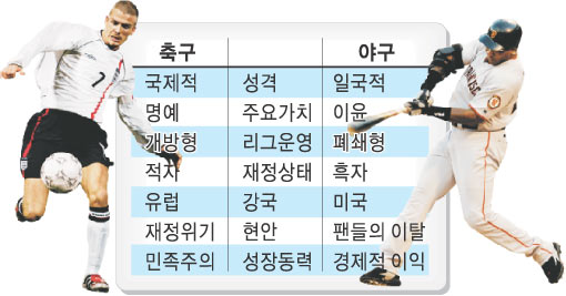 축구와 야구는 세계적으로 가장 유명한 스포츠다. 대중적 인기로 보나 상업적 성공으로 보나 두 종목은 여타의 스포츠를 압도한다. 그러나 세계 스포츠의 절대강자라는 공통점을 제외하면 둘은 매우 이질적인 종목이다. 단적으로 축구는 전 지구적인 스포츠지만 야구는 미국과 중남미,일본,한국 등 10여개 국가에서만 즐기는 지역적 스포츠다. 또 미국인들은 야구에 열광하지만 축구엔 냉랭하고,유럽인들은 축구광들이지만 야구는 거의 하지 않는다.