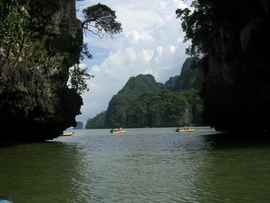 팡아만 투어중 아름다운 바위들 틈의 카누들....