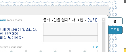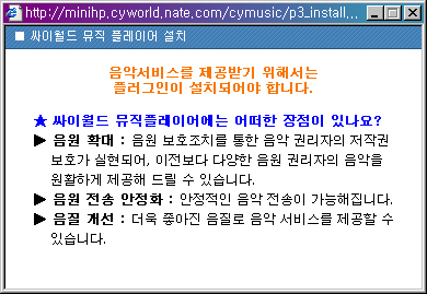 자 여러분, 참으로 치사한 싸이월드입니다. 어느날 곁다리로 두고 쓰는 컴퓨터를 포맷하고 친구인 Y양의 싸이월드 미니홈피에 접속하자, 위와 같은 메시지가 뜨더군요. 나는 웹서핑을 하다 갑자기 노래가 나오는 것 같은 일을 굉장히 싫어하기 때문에 무시하고 몇 달을 살다가, 아, 내 친구의 음악 취향은 어떤 걸까- 싶어서 [설치] 라고 쓰인 곳을 클릭했습니다. 그러자 다음과같은 팝업창이 눈 앞에 팝- 하고 나타납니다.