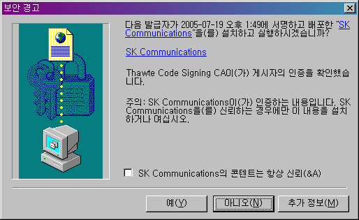 이런 Active X 설치 경고창이 떴습니다. 나는 거의 모든 Active X 어플리케이션 배포자들이 하는 말들과 전혀 차이가 없는 말들을 귓등으로 흘려보낸 뒤 '예' 버튼을 눌렀고, 잠깐 다운로드가 진행되고 CPU 사용률이 높아지는 것 같더니 별안간 음악이 나오기 시작했어요. 내 친구 A양의 미니홈피에서도 이제는 별 문제 없이 음악이 나오기 시작했고요.