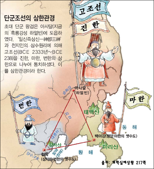 그렇다면 삼한관경제는 도대체 무엇이란 말인가. 삼한관경제는 바로 고조선의 국가 통치원리, 국가 경영원리를 가리키는 것으로서 나라의 강역을 진한, 번한, 마한 셋으로 나누어 통치하는 방식을 말한다. 진한은 만주일대로서 단군왕검이 직접 다스리고 요서와 한반도에 자리잡았던 번한과 마한은 각기 단군을 보좌하는 부단군이 다스렸다. 고조선의 통치 방식은 커녕 실존하던 국가였다는 사실조차 제대로 들려주지 못하는 것이 지금의 역사교육이다. 삼한관경! 우리 역사의 최전성기인 고조선의 실제 역사는 실로 이러하다. 이럴진데 우리는 우리의 갈급증을 채워주지 못하는 뿌리잘린 역사만을 배워왔던 것이다. 자세한 이야기를 하자면 끝도 없기에 일단은 넘어가자.