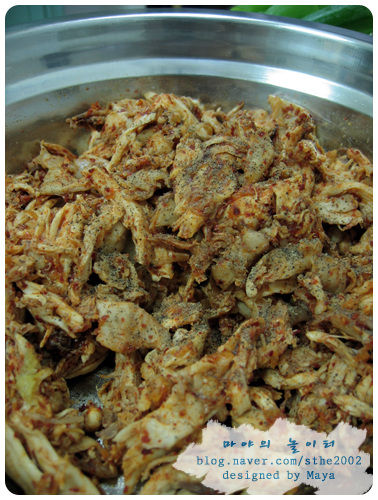 국간장 3스픈, 고춧가루10스픈, 기름 5스픈, 다진마늘 두스픈, 소금, 후추