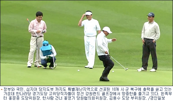 파란 잔디에서 `굿~ 샷'을 외치며 마냥 즐거워하는 이들의 표정에는 10일 넘게 수마가 할퀴고 간 국가적 재앙은 안중에도 없는 듯 했다. 고작 하루전 당 지도부가 사태의 심각성을 고려해 의원과 당원들의 외유 및 골프 금지령을 내리고, “365일 동안 현충일 같은 기분으로 임하라”는 지침을 내렸지만 이들에겐 공염불이었다.