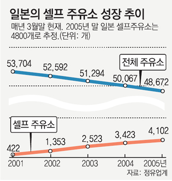 정유업계 관계자는 한국에서 셀프 주유소가 부진한 데 대해 “일반 주유소보다 L당 50원가량 싸게 넣을 수 있다지만 20L를 넣어도 1000원밖에 차이가 나지 않는다”며 “그 정도 가격차로 운전자들이 손에 기름을 묻히려고 하지는 않을 것”이라고 말했다.
