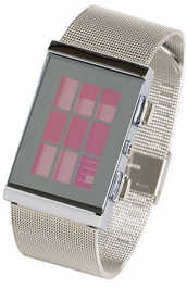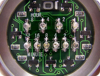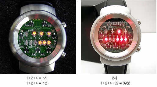 상단의 4개의 LED로 시간을 표시 합니다 오른쪽부터 1.2.4.8 이라고 써있습니다 하단의 6개 LED로 분을 표시합니다 불이켜진 LED를 더한값이 시간이 됩니다 엄격하게 따지면 2진수보다는 각값을 더해 만든 BCD코드 타입이네요밤에는 乃-------------------------------------------------------------------------------