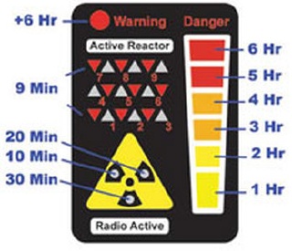 오른쪽에 점등되는 6개의 LED는 1~6까지의 시간을 표시하고 warning에 불빛이 들어오면 +6을 해줍니다.가운데 핵마크와 비슷한 삼각형 LED는 10분 20분 30분을 표시하고각각을 더함으로써 40분 50분을 표시합니다 1에서 9까지의 삼각형 LED는 1분단위를 표시합니다