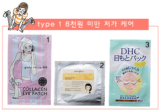 1_에뛰드하우스 콜라겐 아이패치 건조하고 탄력 없는 눈가에 콜라겐과 비타민을 공급해 탄력을 준다. 2매 한 세트로 1천원 . 2_이니스프리 홈스파 릴랙싱 아이 마스크 로열젤리 추출물이 영양 을 주어 다크서클을 방지하는 젤 타입 아이시트. 2매 한 세트로 3천원. 3_DHC 눈 전용 시트 팩 올리브와 대두 엑기스가 눈가에 집중적으로 탄력을 준다. 2매 6개 세트 7천5백원.