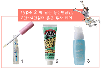 1_DHC 리프팅 젤 주름케어와 커버 를 동시에! 키토산 성분의 젤이 건조되면서 피부가 팽팽해진다. 2만원.2_베네피트 디 퍼핑 액션 아이 젤 콩 추출물이 탄력을 주고 식물 복합체가 즉 각적으로 부기를 제거해준다. 3만9천원. 3_비오템 이드라데톡스 이으 눈가 독소를 제거해 다크서클을 완화하고 수분을 공급해 잔주름을 예방해준다. 4만6천원 .
